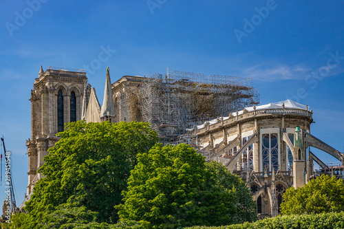 Notre Dame de Paris reconstruction, scaffoldings and work in progress after the fire destroyed the cathedral on 15 April 2019