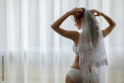 Morning bride. A beautiful girl with a white veil on her head stands near the window. Wedding portrait for the bride. Boudoir shooting. The bride in white beautiful underwear.