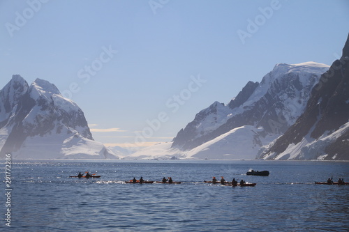 ludzie na łodzi motorowej pomiędzy krami i górami lodowymi wpływający do zatoki u wybrzeży antarktydy