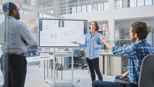 In Industrial Design Facility Team of Engineers and Technicians have a Meeting, Female Specialist Leads Briefing, Talks and Draws on Digital Interactive Whiteboard with Car Prototype Concepts