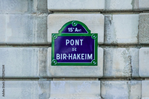 Bir Hakeim bridge street sign near the Eiffel Tower and the Ile aux Cygnes in Paris France