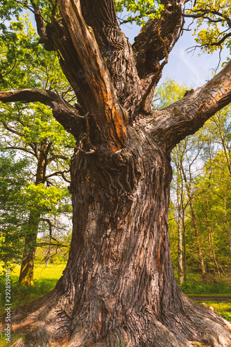Alte Eiche, Baumriese vor Waldhintergrund mit frischen, grünen Blättern