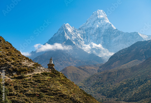 Buddhist stupa at the edge of the mountain with beautiful view of Mt.Ama Dablam