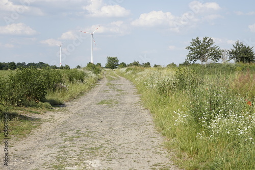 Weg in der Natur und Windräder im Hintegrund