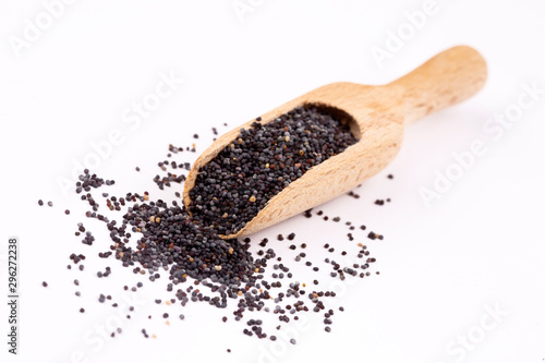 Closeup of ripe dry poppy (Papaver sp.) seed head and seeds isolated
