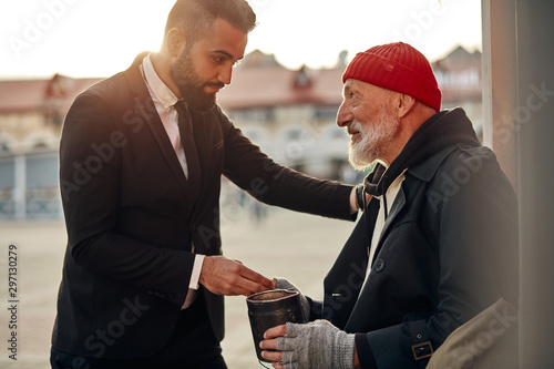 Man in tuxedo came up to beggar to help, give money donation. Rich man hold out his hand with money to homeless person. People relationship concepr