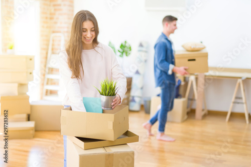 Beautiful young couple smiling in love holding cardboard boxes, happy for moving to a new home