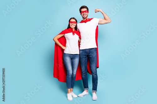 Full length body size view of nice attractive lovely content cheery sporty people hugging in red hero look guy showing arm muscle isolated on bright vivid shine vibrant blue turquoise background