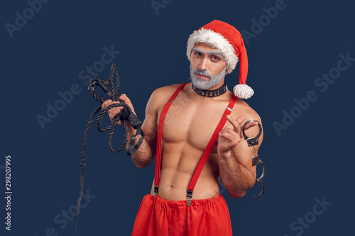 Adult Santa Claus standing with handcuffs and flogging whip in hands