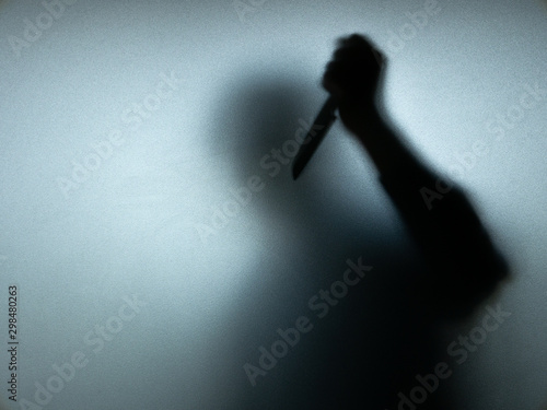 Halloween concept. Blurred shadow of hand holding sharp knife behind white mirror background. Murder scene.