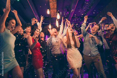 Photo of shouting overjoyed happy cheerful corporate people gathering standing in rain of confetti celebrating their friend birthday enjoying youth