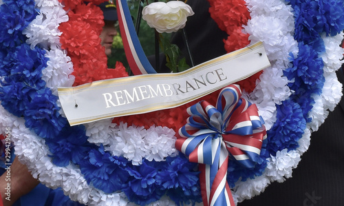 A closeup of the bottom portion of a silk flower veterans memorial day wreath with a small banner of gold-edged ribbon with the word "Remembrance" printed on it.