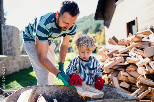 A father and toddler boy outdoors in summer, putting firewood in wheelbarrow.