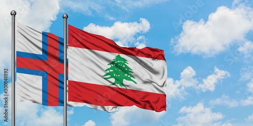 Faroe Islands and Lebanon flag waving in the wind against white cloudy blue sky together. Diplomacy concept, international relations.