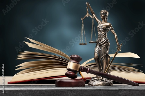 Closeup of a sculpture of Themis, book and gavel, symbol of justice