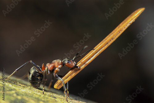 Waldameise trägt Tannennadel, Ameise trägt Fichtennadel, Waldameise mit Baumaterial, Waldameisen Arbeiterin schleppt Tannennadel, Bärenstarke Ameise trägt Nadel