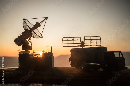 #301873889Silhouettes of satellite dishes or radio antennas against sunset sky. Space observatory.