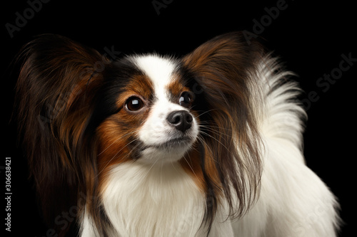 Portrait of White Papillon Dog, Looking up on Isolated Black Background