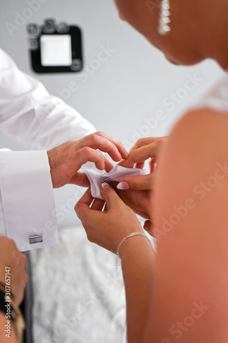 Kobieta pomaga zapinać guziki na męskiej koszuli. Przygotowania weselne