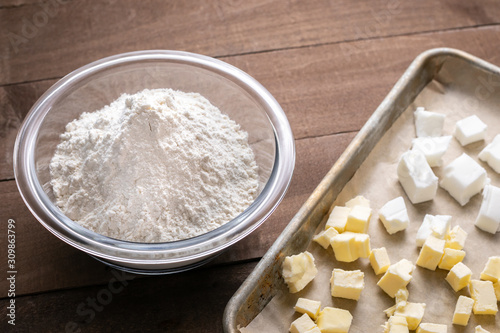 Bowl of flour beside a sheet pan with butter and shortening