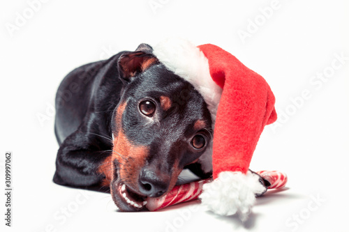 miniature pinscher puppy in a red santa hat nibbles on a candy cane on a white background