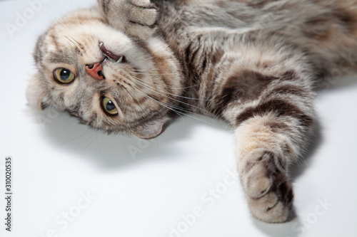 American curl cat Silver tabby color Which ears, roll cute ginger kitten in the fluffy pet Poses comfortably is happy. Cat breed originated from American Curl cat and American Short Hair cat breeder.