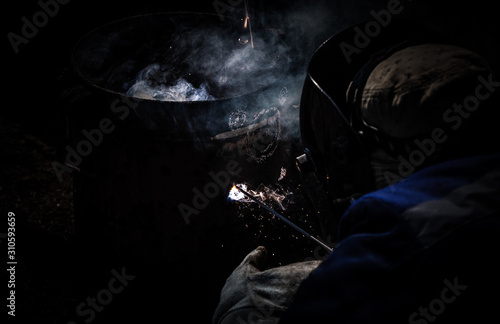 An experienced welder at work. Preparation and welding process of cast iron furnace. Selection focus. Shallow depth of field. Toned