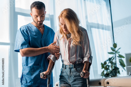 handsome doctor standing near woman with crutches