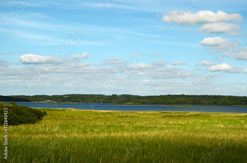 Landscape in Tempelkrog.Sjaelland.Denmark.Blue sky and Holbaek municipality overlooking the Munkholm Bridge on the other shore. Vipperod locality in the Isefjord..
