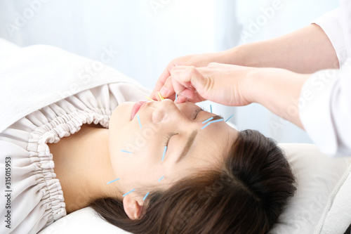 鍼灸院で顔に鍼を打たれる女性と施術者の手元