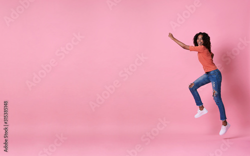 Joyful young african woman in orange shirt jumping and celebrating over pink banner background with copy space.