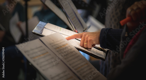 Hand zeigt auf Noten bei Chorprobe, geringe schärfentiefe