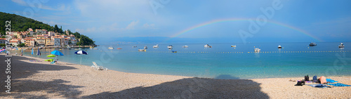 beach panorama Moscenicka Draga, adriatic ocean with boats, rainbow over the water