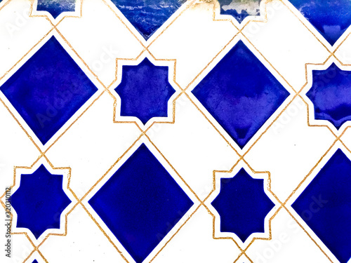 White-blue tile background, typical emblem of southern Spanish Andalusia, decoration of houses and buildings of various kinds on Cosa del Sol
