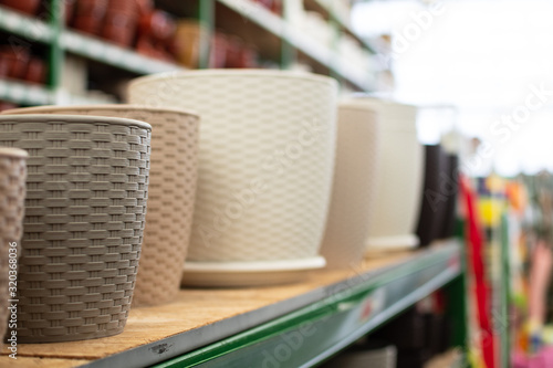 plastic flower pots, pots for indoor plants, garden tools store, shelves with flower pots