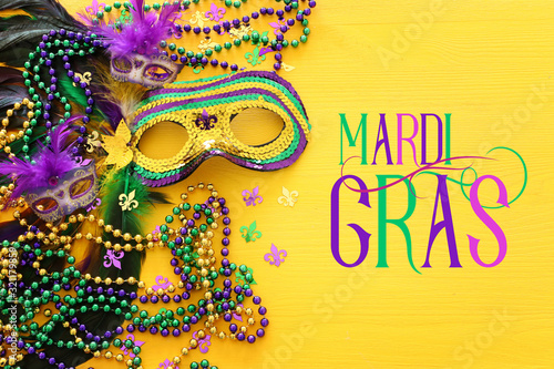 Holidays image of mardi gras masquarade venetian mask over yellow background. view from above