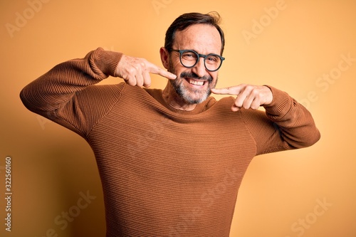 Middle age hoary man wearing brown sweater and glasses over isolated yellow background smiling cheerful showing and pointing with fingers teeth and mouth. Dental health concept.