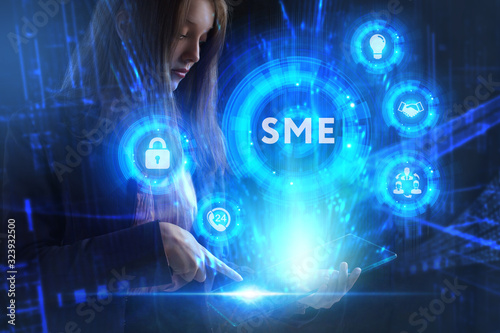 Business, Technology, Internet and network concept. Young businessman working on a virtual screen of the future and sees the inscription: SME