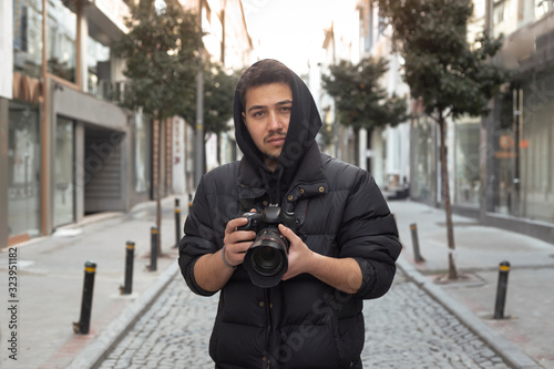 Young photographer taking photos on the streets of the city