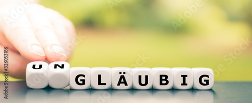 Hand dreht Würfel und ändert das Wort "gläubig" in "ungläubig"