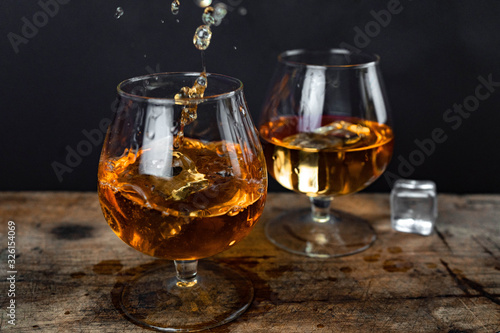 Two whiskey / cognac glasses with ice on a wooden background. Dark backdrop.
