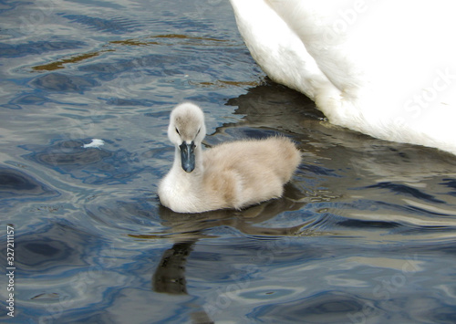 Close up of a young cygnet, which is a baby swan