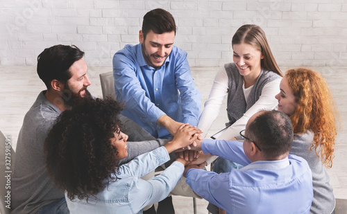 Happy people sitting in trust circle and putting hands together