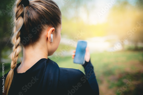 Young smiling girl making sport and running in the park using her phone to listen the music with wireless headphones on sunset in the city watching the screen