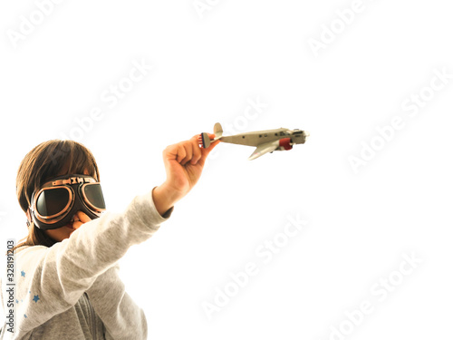 concept of dreams and travels. pilot aviator child with a toy airplane plays at home in his room
