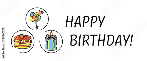 Vector birthday card with gift box, holiday cake and bunch air balloon hand-drawn
