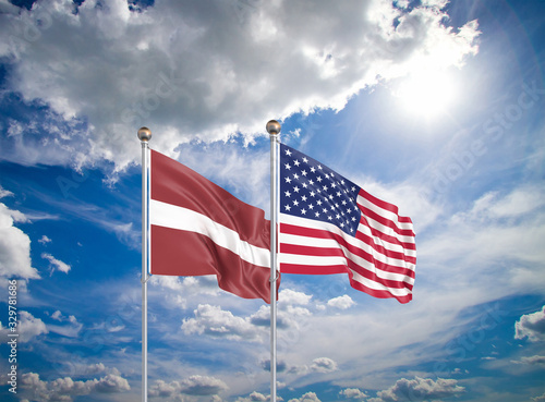 United States of America vs Latvia. Thick colored silky flags of America and Latvia. 3D illustration on sky background. - Illustration
