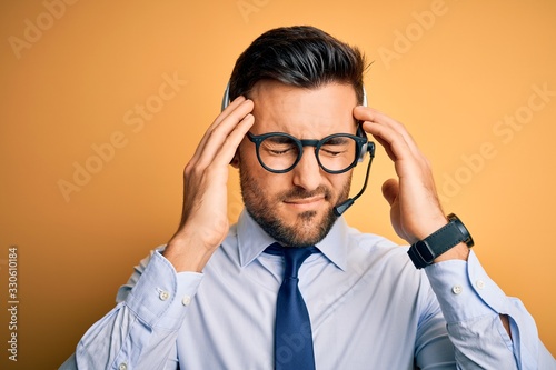 Young business operator man wearing customer service headset from call center suffering from headache desperate and stressed because pain and migraine. Hands on head.