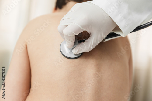 latex gloved hand of a female doctor with a phonendoscope (stethoscope) on a child's back to listen. in the hospital bed or home. home doctor. medical inspection.