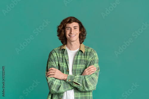 Cheerful millenial guy with curly hair crossing his arms on turquoise background